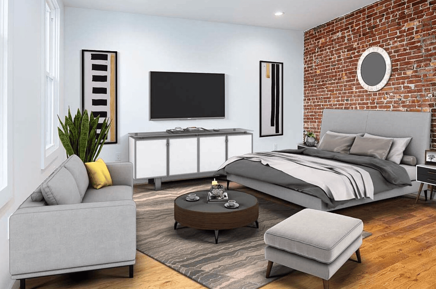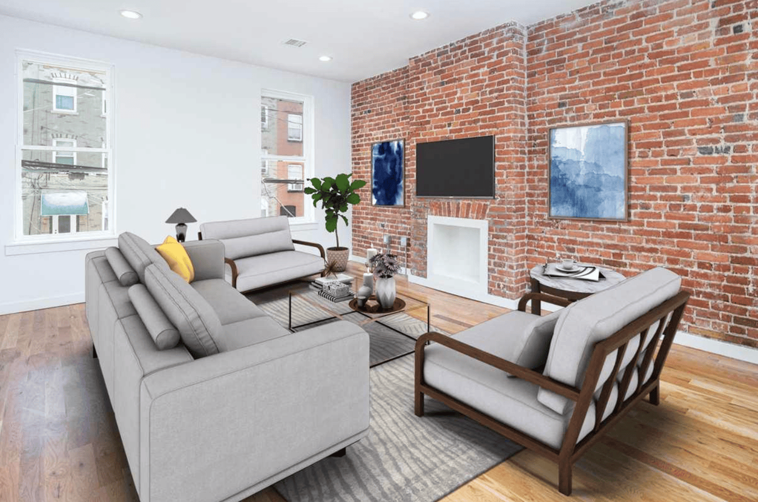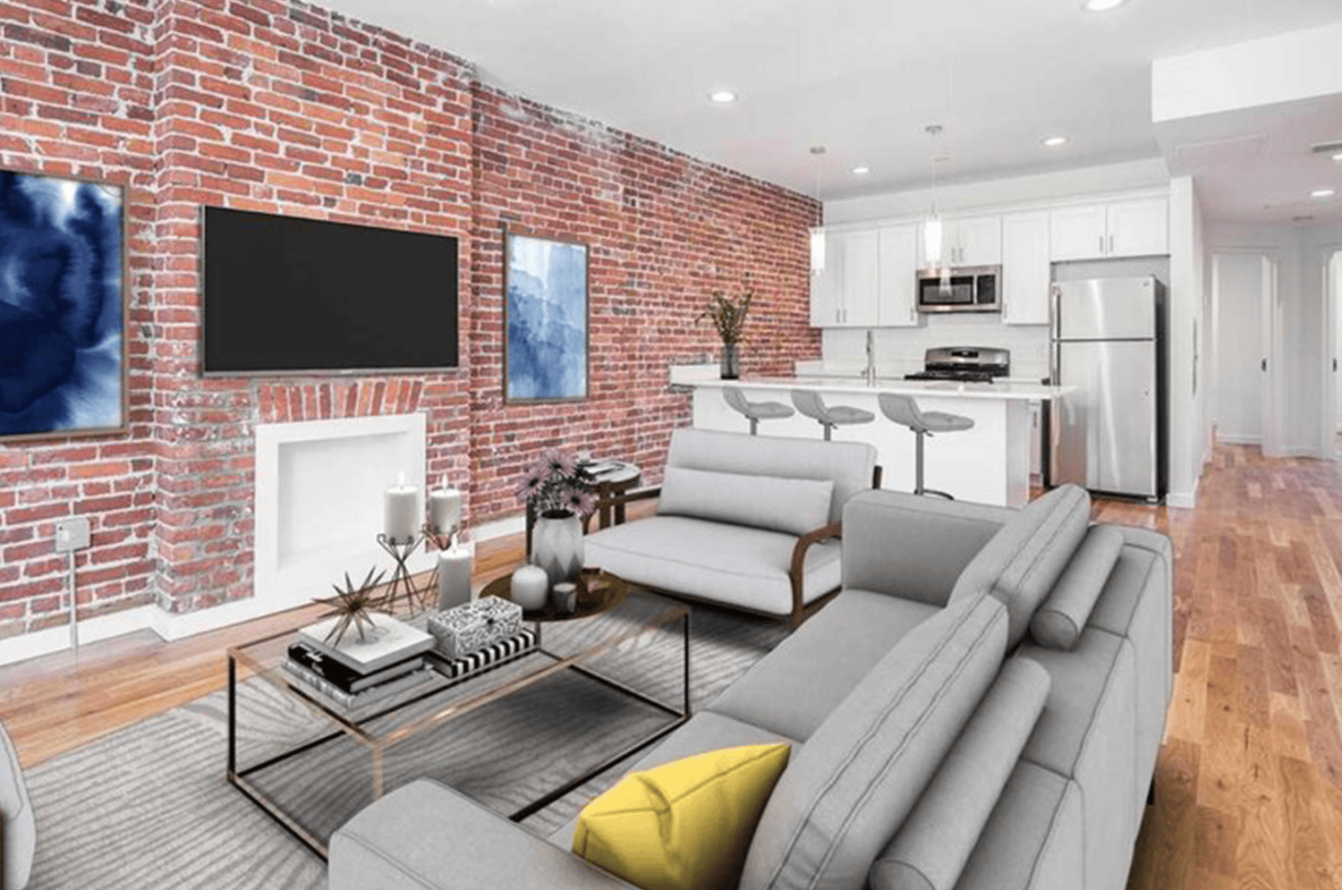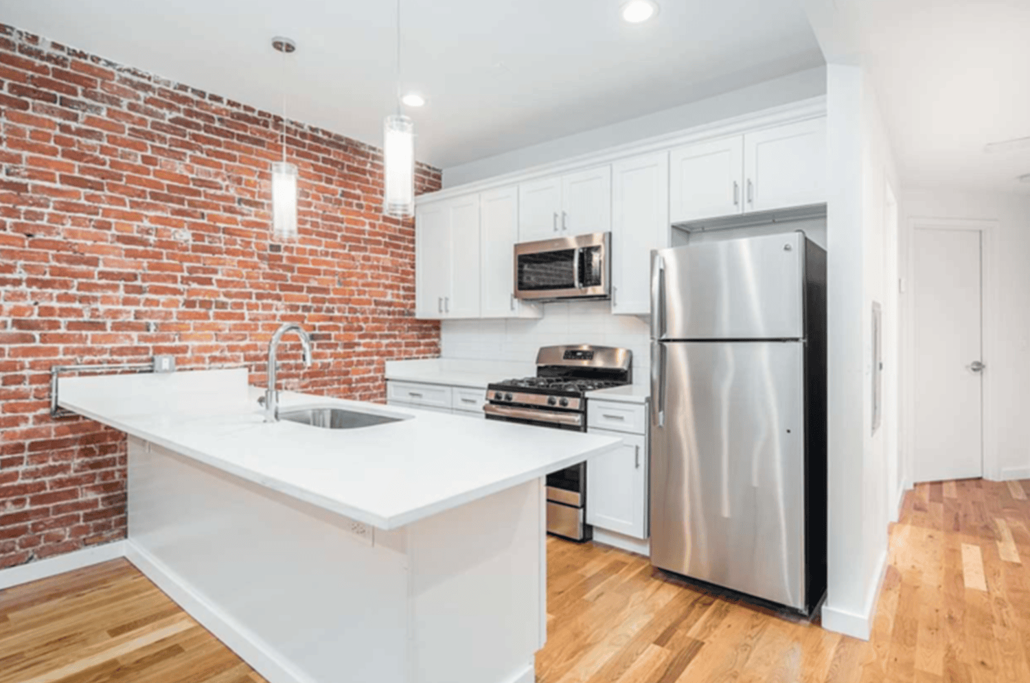 This project is a clean, stylish oasis in the middle of a bustling city. It has a classic townhouse exterior with multiple apartment units. The units have original brick walls, wood floors, expansive windows, modern fixtures, and an overall classic loft-style feel.
